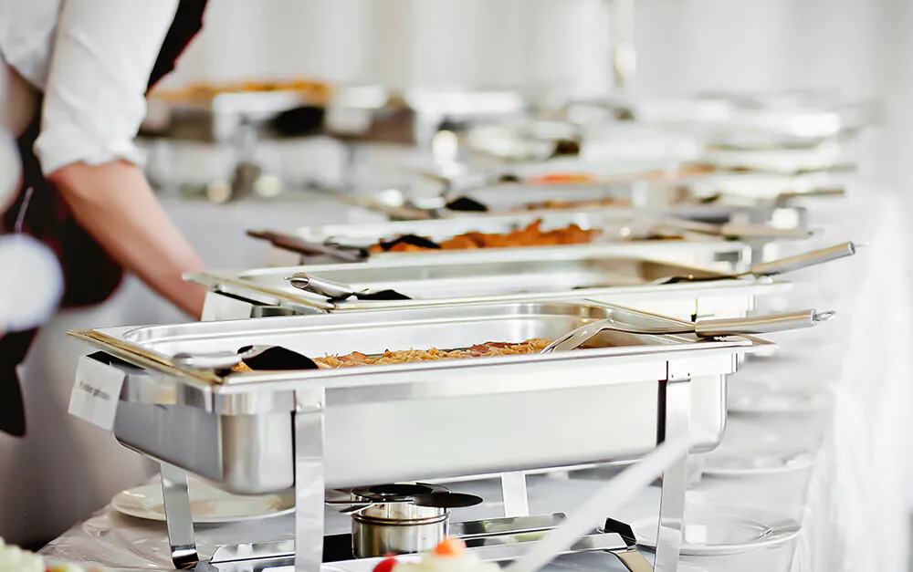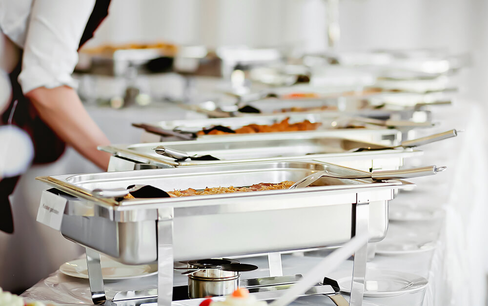 Our food is packaged in half or full-size aluminum pans or plastic platters or bowls. Our aluminum pans fit most standard chafing dishes. We currently do not provide chafing dishes.
